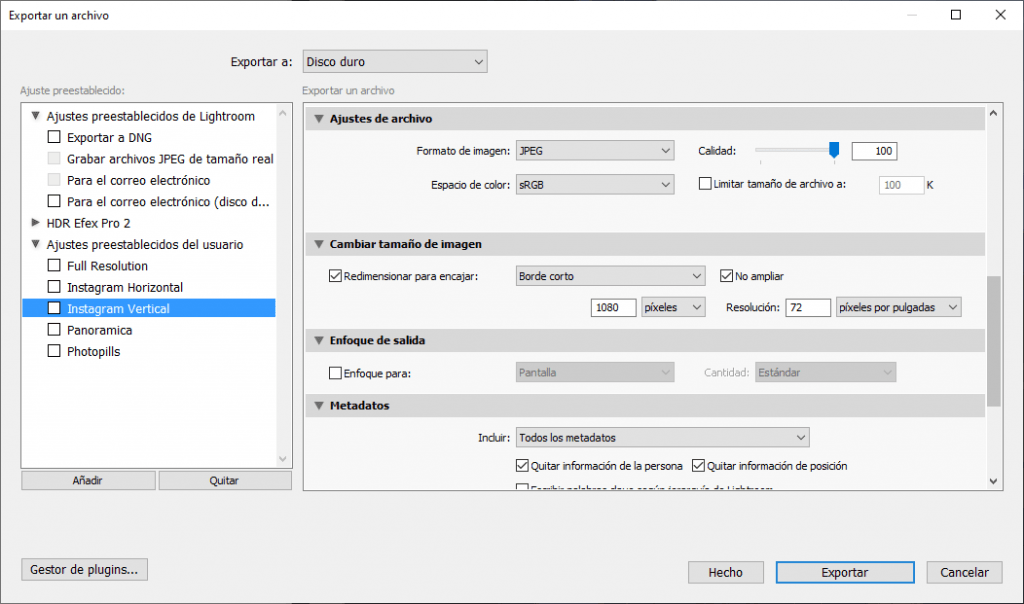 Sin más rodeos, te dejo por aquí mi receta de Exportación que aplico en Lightroom para asegurar que la foto que suba a instagram se verá correctamente. No te preocupes si no usas Lightroom, cualquier aplicación móvil o software de fotografía tendrá opciones similares.
